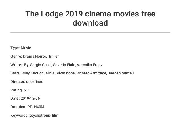 - 4. The Lodge 2019 cinema movies free download Type: Movie Genre: Drama,Horror,Thriller Written By: Sergio Casci, Severin Fiala, Veronika Franz. Stars: Riley Keough, Alicia Silverstone, Richard Armitage, Jaeden Martell Director: undefined Rating: 6.7 Date: 2019-12-06 Duration: PT1H40M Keywords: psychotronic film